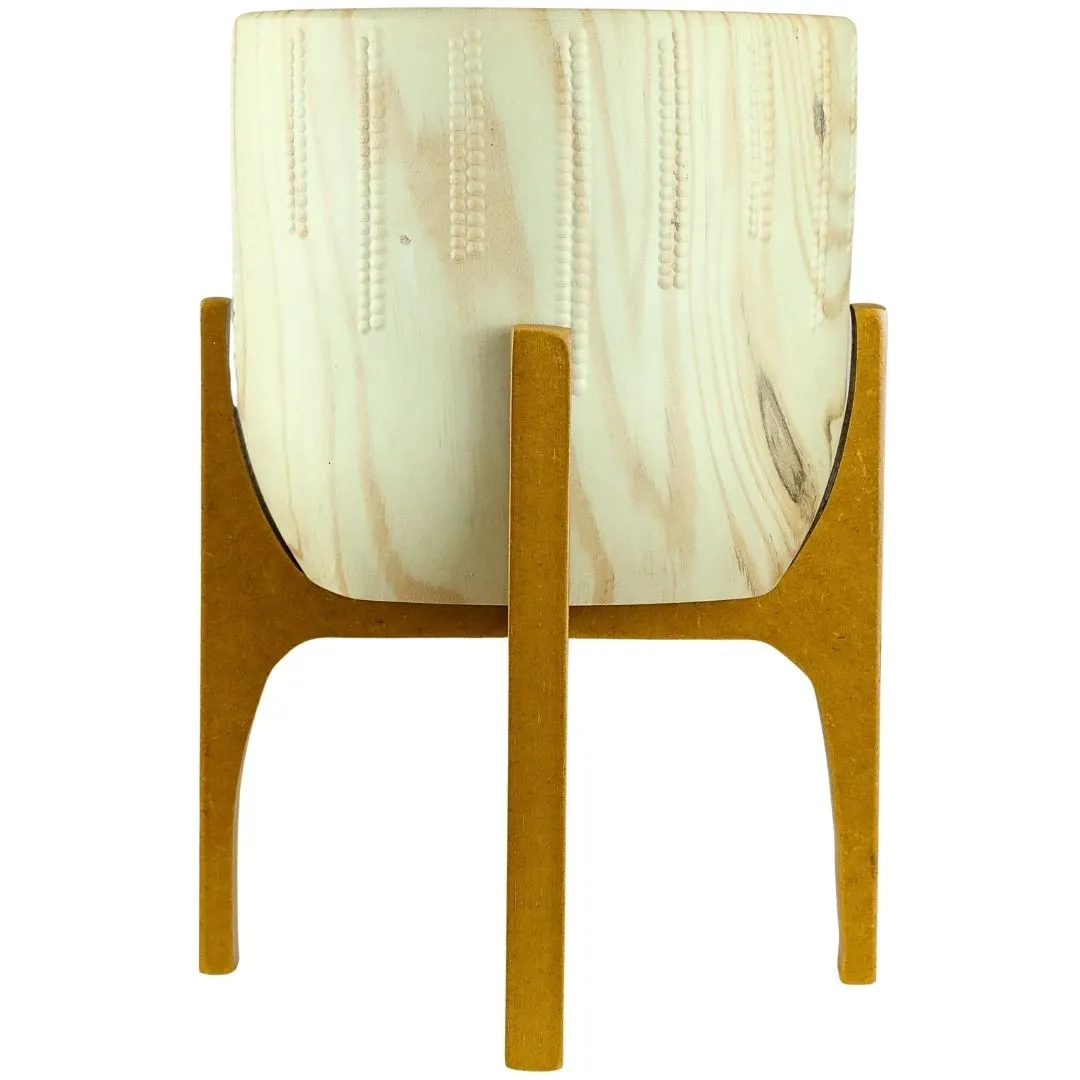 Com acabamento texturizado e pintura de veios que remetem à madeira, o vaso é feito em cerâmica de alta qualidade, criando um contraste encantador com o suporte de madeira, disponível em dois acabamentos distintos: